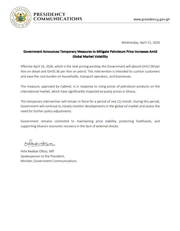 The full text of the statement confirms the GH¢2.00 per litre diesel and GH¢0.36 per litre petrol absorption, the one-month duration, and the government’s stated commitment to monitoring global oil market developments before any further policy decision is taken.